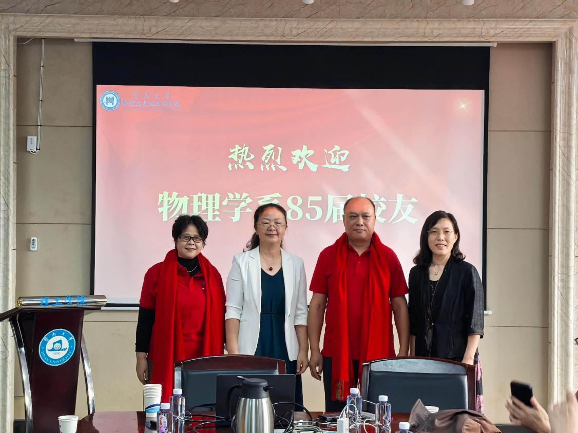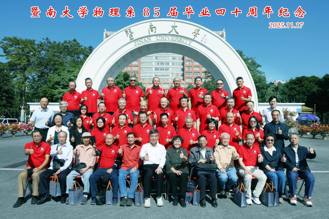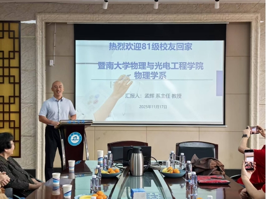 金秋时节,南国暨南园暖意融融。11月17日, 物理学系85届28位校友从加拿大、澳大利亚以及中国香港、中国澳门、北京、海南省、福建省等各地重返暨南园,以“思源”之名共叙师生情谊,以科技之光共绘发展蓝图。物理与光电工程学院党委副书记孙玉环、副院长麦文杰、物理学系党总支书记幸江涛、系主任孟辉,暨南大学原党委副书记、原副校长、物理学系教授叶勤,原理工学院院长张永林教授,党委书记黄国淳教授等十二位退休领导老师一起参加交流。
