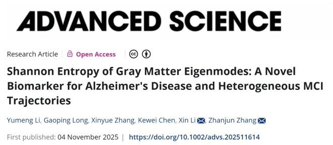 近日,物理与光电工程学院物理学系龙高平副教授在国际著名期刊《Advanced Science》(中科院一区期刊)上发表文章《Shannon Entropy of Gray Matter Eigenmodes: A Novel Biomarker for Alzheimer's Disease and Heterogeneous MCI Trajectories》。该研究由龙高平副教授与北京师范大学张占军教授、李馨教授及李禹蒙博士共同合作完成。龙高平副教授为论文共同第一作者。