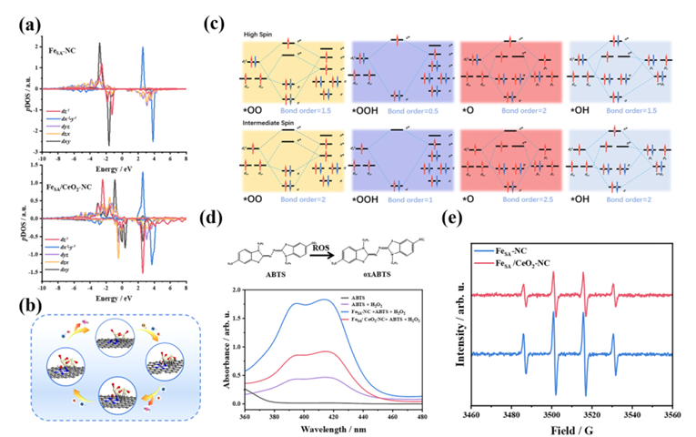 a为模型的自旋分辨态密度图、b-c为FeSA/CeO2-NC及FeSA-NC的自旋态转变的理论见解与轨道能级图解、d-e为CeO2对自由基的清除功能测试