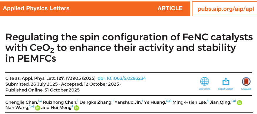 近日,物理学系孟辉教授团队的研究生陈澄杰、陈瑞忠在物理学Top期刊《Applied Physics Letters》(APL)上发表了题为“Regulating the spin configuration of FeNC catalysts with CeO2 to enhance their activity and stability in PEMFCs”的研究论文,这是该团队在物理学Top期刊《Applied Physics Letters》 发表的第五篇论文。该研究通过CeO2调控FeNC催化剂的自旋构型,调整了Fe-3d轨道的能级,进而优化了对反应中间产物的吸附能力。物理学系研究生陈澄杰、陈瑞忠为论文的共同第一作者,孟辉教授、王楠副教授和卿健副教授为论文的共同通讯作者,暨南大学为第一单位。
