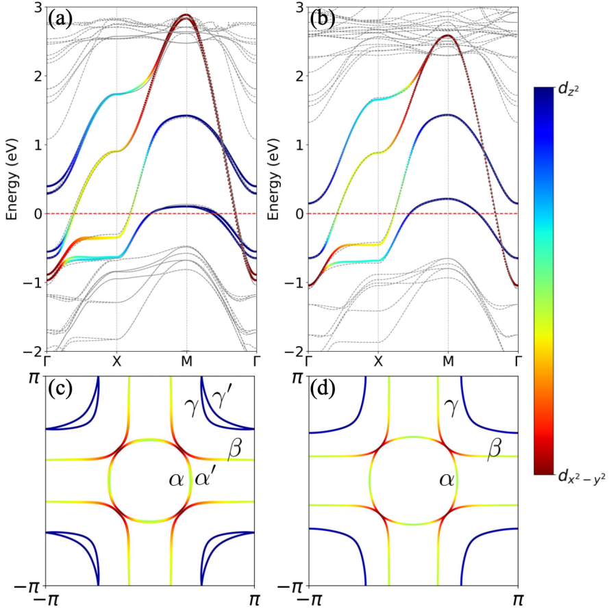 图2. La3Ni2O7薄膜双层两轨道模型能带结构和费米面