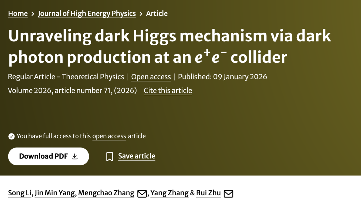 近日,物理与光电工程学院物理学系张孟超副教授在物理学学术期刊《Journal of High Energy Physics》(物理学Top期刊)上发表文章《Unraveling dark Higgs mechanism via dark photon production at an collider》(JHEP 01 (2026) 071)。该研究由暨南大学张孟超副教授与中科院理论物理研究所杨金民研究员、朱睿博士、河南师范大学张阳教授、李松博士共同合作完成。张孟超副教授为论文共同通讯作者。
