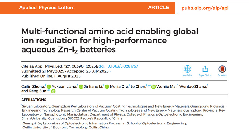 近日,物理与光电工程学院(理工学院)物理学系麦文杰教授纳米能源课题组联合桂林电子科技大学校长张文涛教授团队在物理学Top期刊Applied Physics Letters 发表题为“Multi-functional amino acid enabling global i...